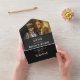 Nichts Extravagant, nur Liebe! Wählen Sie diese elegante minimalistische Hochzeitseinladung mit fett-klassischer Schrift und moderner Typografie auf dunklem schwarzen Hintergrund. Einfach mit Ihren Hochzeitsdetails personalisieren. Eine preisgünstige Einladung für eine klassische, minimalistische Hochzeit zum Thema Gotik. Die Einladung enthält eine UAWG-Abreißkarte mit QR-Code und die Website-Adresse für Online-UAWG. Die Karte kann auch an die Postanschrift des Paares geschickt werden.