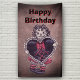 This banner or backdrop is black fading to light grey and pink with a Gothic rag doll in red dress holding a lace trimmed black heart with red bow. Customise your text with the template.