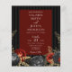 Gotische Rot- und Schwarz-Flora-Hochzeitseinladungen. Imitate golden florale Blätter. Skript-Schriftart-Highlights mit leicht lesbaren Serifennamen Schriftart. Leicht an Ihre Hochzeitsbedürfnisse anzupassen. Alles in einer Einladung
