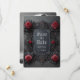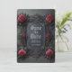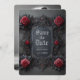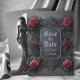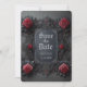 Erzählen Sie Ihre Hochzeitspläne stilvoll mit dieser gotischen, thematisch Save the Date gestalteten Flachkarte mit rote Rosen auf einem extravaganten grauen Rahmen und Ihren Namen, Hochzeitsdatum und Foto auf der Rückseite, um Ihre Wünsche zu erfüllen. Entworfen von Susan Coffey. Bilder, die mit KI erzeugt wurden.