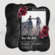 Dunkelschöne Save the Date Karte mit Till Death Do Us Part Sprichwort, dunkle Aquarellfarben-rote Rosen und einem launenhaften schwarzen Aquarellhintergrund. Skripttypografie. Personalisieren Sie mit Ihrem eigenen Foto. Sehen Sie sich die Koordination der Artikel in unserem Shop an.