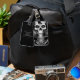 Detaillierte schwarz-weiße Skelettfräse-Gepäckmarke im gotischen Stil mit personalisiertem Namenstext. Passen Sie den Namen und den Text mit Ihren persönlichen Daten an.
