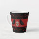 Diese phantastische latte Tasse zeigt ein grafisches Bild eines Schädels mit roten Augen und gelben Zähnen, die mit Rissen bedeckt sind. Der gruselige Schädel hat einen großen Rabe, der auf beiden Seiten wie ein Wächter stehend ist. Die Raben sind schwarz mit grauen Beinen und Klauen. Sie haben auch schwarze, beattelte Augen.