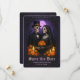 This romantic gothic wedding save the date announcement flat card features a skull candy skeleton couple dressed in wedding attire with candles and orange flowers with your names and wedding date . The back of the card reads "Till Death Do Us Part". Images generated with AI.