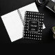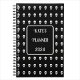 Muster weißer Schädel auf schwarzem Hintergrund. Dieser Planer ermöglicht Ihnen, Ihre Aufgaben so zu planen, wie Sie es möchten.Personalisieren Sie Ihren Namen, Titel und Jahr.