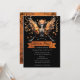 Spooky Schädel Fee Halloween Kostüm Party in Orange und Schwarz. Im Hintergrund befindet sich eine bedrückte Kontur in Orange und Schwarz, die den Rose auf dem Schädelkopf entspricht. Composite Design von Holiday Hearts Designs.
