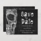 Gothischer Schädel Kopf Save the Date Vintage schwarz-weiß Halloween Budget Hochzeitseinladung flache Karte. Spaß, spuke Hallowedding. Bis Tod tun uns Teil Skript. Bildrecht Marg Seregelyi Fotografie.
