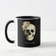 Gothic Bloral Skull personalisierte Kaffee-Tasse. Das Design besticht durch einen Schädel mit schönen weißen Rosen auf schwarzem Hintergrund und ein elegantes und edges, gotisches Aussehen. Personalisieren Sie diese Tasse mit Ihrem Namen, um sie wirklich einzigartig zu machen. Perfektes Geschenk für diejenigen, die gotischen Stil und dunkle Eleganz Liebe.