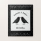 Dieses phantastische Puzzle zeigt ein digitales Kunstbild eines wunderschönen schwarzen Raben, das sich gegenübersteht und aussieht, als würden sie sich küssen. Sie sind schwarz mit beatenen Augen und grauen Schnallen und Füßen. Weiße Sterne auf schwarzem Hintergrund über und unter den Vögeln. Es gibt einen eigenen Text, damit Sie die Namen des glücklichen Paares und das Hochzeitstag angeben können.