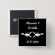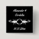 Dieser phantastische Hochzeitsknopf zeigt ein digitales Kunstbild eines wunderschönen, weißen Skorpions, die sich gegenüberstehen. Jeder Skorpion ist weiß und hat acht Beine, einen giftigen Stachel und ein Paar Pincers. Die Brustbänder werden zusammengehalten, um die Form eines Herzens zu bilden. Der Hintergrund ist schwarz. Ein schönes gotisches Hochzeitsdesign. Es gibt einen eigenen Text, damit Sie die Namen des glücklichen Paares und das Hochzeitstag angeben können.