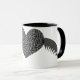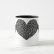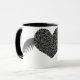 Diese Tasse besticht durch ein hübsches, gotisches, schwarzes Herz und das Erscheinungsbild einer feinen Spitze. Das Herz ist auf beiden Seiten mit leuchtenden silbernen Metallflügeln flankiert. Das Design wird auf einer Kaffee-Tasse im Schwarz-Weiß-Ringer-Stil gezeigt, ist aber auch in vielen anderen Stilen und Farben von Tasse erhältlich.