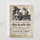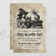 Gotisches Halloween-Party im Vintagen Stil mit einer wunderschönen Hexe mit ihrem Wolf, einer Spinne und einem Schädel auf alten Büchern, um Ihnen eine sprichwörtliche Atmosphäre zu verleihen. Alte Papiertextur und altgediegener Text.