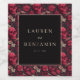 Dieses Weinlabel für Hochzeiten zeigt ein elegantes Design mit einem zentralen schwarzen Quadrat, das von komplizierten roten floralen Motiven und subtilen Totenkopf-Akzente gerahmt wird, wodurch ein gotisches, aber dennoch romantisches Thema entsteht. Die Farbpalette umfasst tiefe Rottöne, Burgunderrot und Schwarz, ergänzt durch gedämpften goldenen Text in einer klassischen Serifenschrift, die für Raffinesse sorgt. Perfekt für formelle Feiern kombiniert dieses Label makabre Elemente mit aufwendigen Blumenmustern, um eine Stimmung von Geheimnis und Verfeinerung zu vermitteln, und ist somit ideal für diejenigen, die einen einzigartigen und stilvollen Touch für ihren besonderen Tag suchen.