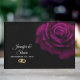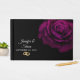 Ein Hochzeitsgast-Buch mit einem nahen Bild einer gotisch aussehenden lila magentafarbenen Rose. Ein dunkler und geheimnisvoller Stil. 2 goldene Hochzeitsringe unterhalb des personalisierten Textes.