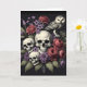 Ein gotisches Bouquet mit staubigen roten und violetten Blumen und graugrünen Blätter mit drei Schädeln und einer kleinen Eule macht eine schöne Geburtstagskarte. Schön und dunkel elegant.