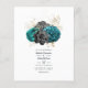 Gotische Hochzeitseinladung mit Rose, Schädeln und Damast in Akzenten von schwarz, aquamarin, türkis und goldfarben, angepasst an Ihre Veranstaltungsspezifikationen. Umschläge sind nicht enthalten. Für dickere Einladungen mit Umschlägen und passenden Produkten zum selben Thema lesen Sie bitte die unten stehende Kollektion.