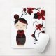 Dieses Kokeshi trägt einen Holzkohle Kimono mit Blumendruck. Ihr Kimono hat Blumen und Wirbel mit dem roten Nähen.