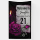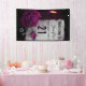 Ein Geburtstagsbanner mit gotischem Look. Ein altes graues Pergamentpapier mit lila-roten Farbtupfern an den Kanten. Eine magentafarbene Rose in voller Blüte, ein Rosenbud, eine Kerze und ein silberner Schrank auf dunkelbordeauxfarbenem Hintergrund schaffen ein schönes, dunkles und geheimnisvolles gotisches Design.