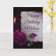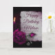 Eine Geburtstagskarte mit einer personalisierten Nachricht im Inneren. Entworfen mit einem gotischen Look. Ein altes graues Pergamentpapier mit lila-roten Farbtupfern an den Kanten. Eine magentafarbene Rose, ein Rosenbud, eine Kerze und ein silberner Verschluss auf dunkelburgundigem Hintergrund schaffen einen schönen und geheimnisvollen Gruß zum Geburtstag.