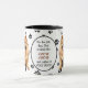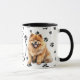 Ein wunderschöner, orangefarbener ChowChow Hund sitzt auf beiden Seiten dieser Tasse. Der Text zwischen den beiden Bildern sagt: "Am 8. Tag erschuf Gott das CHOWCHOW und nannte es SEHR GUT". Die Hundebilder und das weiße ovale Banner mit den Textfeldern werden auf einem weißen Hintergrund mit schwarzen Pfoten platziert.