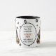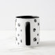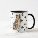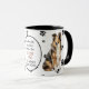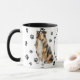 Ein schöner, rauer Collie Hund sitzt auf beiden Seiten dieser Tasse. Der Text zwischen den beiden Bildern sagt: "Am 8. Tag erschuf Gott den COLLIE Hund und nannte ihn SEHR GUT". Die Hundebilder und das weiße ovale Banner mit den Textfeldern werden auf einem weißen Hintergrund mit schwarzen Pfoten platziert.