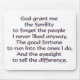Gott bewilligen mir die Altersschwäche, um die Leute zu vergessen, die ich nie irgendwie mochte, das Glück, zum in die zu laufen sehe ich und das Sehvermögen den Unterschied. - Parodie des Ruhe-Gebets. Lustiges und humorvolles Sprichwort.