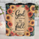 Das elegante schwarze Skript lautet "Gott ist in ihr, sie wird nicht fallen" zentriert auf einem weichen, gesprenkelten beigen Hintergrund, mit dem Bibelvers "Psalm 46:5" unten. Der Text ist wunderschön gerahmt durch eine lebhafte Anordnung von orangen und gelben Sonnenblumen, grünen Blätter und kleinen blauen Beeren, die ein ruhiges und inspirierendes Blumendesign schaffen.