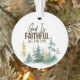 Personalisierte Weihnachtsschmuck mit inspirierendem Zitat zeigt ein einfaches naturfarbenes Design mit einem Wald aus grünen und goldenen Kiefern. Es enthält ein ermutigendes Christliches Zitat: "Gott ist treu die ganze Zeit." Die Rückseite mit Namen und Jahr oder die Details Ihrer Wahl angepasst.