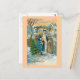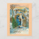 Eine wunderschöne schwedische Weihnachtskarte mit dem Weihnachtsmann, der an einem Gartentor ankommt, mit einem großen Sack an Geschenken und Spielzeug.
