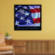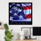 Ein abstraktes patriotisches Bild mit einem Wasserfall über einem Fahnenhintergrund, dessen konzentrische Kreise nach außen strahlen. Möge Gott Amerika segnen.
