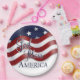 Das Design von "Gott segne AMERICA" hat einen marineblau-blauen Hintergrund mit weißen Sternen oben und rot-weißen Streifen in der Mitte. Die Flagge ist schattiert, um wie eine winzige Flagge auszusehen. "God Bless" ist oben auf der Fahne in einem handgemalten Aussehen mit Weiß auf der Unterseite und Marineblau auf der Oberseite. AMERIKA ist in ganz Marineblau. Große Teller auf Papier, die Sie am nächsten 4. Juli oder patriotisches Party verwenden können.