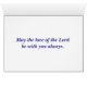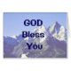 Gott segne Sie Card mit blauschneebedeckten Bergen auf der Vorderseite. Das Innere lautet: "Möge die Liebe des Herrn immer bei dir sein." Auf dem Rücken steht: "Habt Glauben."