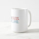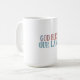 farbenfrohe Tasse mit dem Satz "Gott segne unser Land" in einem spielerischen, Cartoon Schriftart gedruckt. Die Tasse ist mit patriotischen Symbolen wie US Flagge geschmückt.