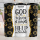 Dieses Bild zeigt eine mächtige Schrift, in der es verkündet: "Gott ist unsere Zuflucht und Stärke, eine JE HEUTIGE Hilfe IN TROUBLE." Der Text ist Set vor einem auffälligen Hintergrund, der in drei senkrechte Bereiche unterteilt ist: ein strukturiertes schwarzes Rautenmuster mit goldenen Kreuzen auf den links, ein glänzender goldener Glitzer Streifen in der Mitte und ein schlichter weißer Bereich rechts. Dieses Design vermittelt göttlichen Schutz und unerschütterliche Unterstützung in Zeiten der Not.