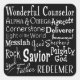 Die Bibel hat viele Namen Gottes, um uns daran zu erinnern, wer Er ist für uns. Einige davon sind auf diesem Aufkleber kunstvoll geschrieben. Die Namen sind "wunderbarer Counselor, Alpha & Omega, Advocate, Cornerstone, Deliverer, Licht der Welt, Immanuel, Messiah, Good Shepherd, Rock, Retter, Mighty God, Good Vater, Redeemer".