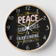 Eine schwarze Uhr mit einem kraftvollen Bibelzitat in fett gedruckter Schrift, die einen auffallenden Kontrast zum dunklen Stoff schafft. Der Frieden Gottes übertrifft das Verständnis.