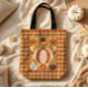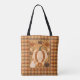 Ein modernes Volkskunstwerk mit den Farben des Herbstes auf dekorativen Kürbissen, Gourds und Blättern vor einem rustikal braunen karierten Hintergrund bedeckt diesen gemütlichen Herbst-Totbeutel.