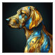 Ein Portrait, das den Kopf eines Hundes in einer stilvollen Pose vor einer dunklen Kulisse einfängt. Dieses abstrakte, farbenfrohe Kunstwerk besticht durch eine Farbpalette aus Blau, Türkis, Gelb, Orange und Gold. Die künstlerische Textur und die Farben schaffen eine lebendige und elegante Darstellung unseres geliebten Vierbeiner Freundes.
