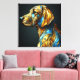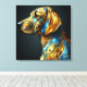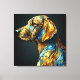 Ein Portrait, das den Kopf eines Hundes in einer stilvollen Pose vor einer dunklen Kulisse einfängt. Dieses abstrakte, farbenfrohe Kunstwerk besticht durch eine Farbpalette aus Blau, Türkis, Gelb, Orange und Gold. Die künstlerische Textur und die Farben schaffen eine lebendige und elegante Darstellung unseres geliebten Vierbeiner Freundes.