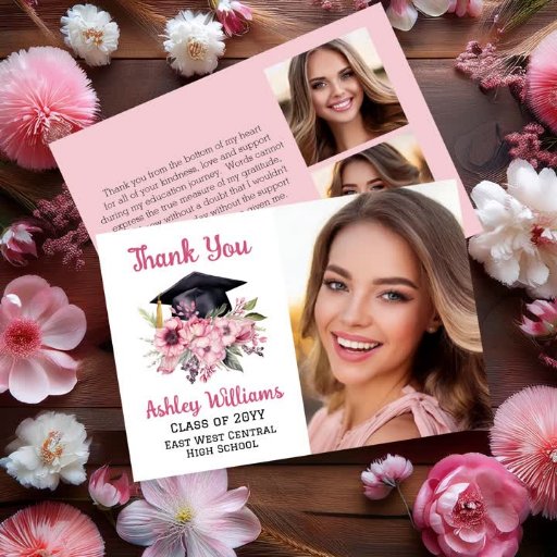 Grad Cap und Pink Florals 3 Foto Abschluss Dankeskarte