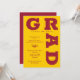 GRAD in knallroten Buchstaben Kurven um die Ränder dieser gelben goldenen Graduierungsparty Einladungen. SEHEN SIE DIE GESAMTE SAMMLUNG von Fertigfarben, Tellern, Servietten und mehr in unserem Geschäft.