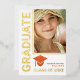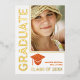 Individuelle Graduierung Einladungen mit Ihrem Foto und ein wenig Imitat orange Glitzer Glam und echte Folie Akzente, die leicht zu personalisieren sind. Erstellen Sie Ihre eigene Graduierungsparty oder Abschluss Zeremonie Einladungen, indem Sie Ihr Foto und den Namen Ihres Absolventen in orangefarbenem Text neben dem Imitat Glitzer orange Graduiertenkappengrafik. GRADUATE in fett formatierten Schriftzeichen entlang der links Seite der individuellen Einladung sowie der KLASS OF 20XX, wo Sie das Schuljahr Ihres Absolventen hinzufügen können und der dünne Rand um Ihr Foto sind alle in realer Folie für den Glücksfaktor gedruckt. Jede personalisierte Abschluss-Einladung kehrt zu einem soliden, orangefarbenen Hintergrund zurück, mit einer Textvorlage in weißer Schrift, in der Sie alle Ihre Party Einladung-Details hinzufügen können.
