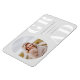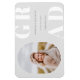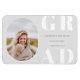 Runder Foto-Rahmen, Senior Class Abschluss Ankündigungsmagnet. Weich silbergrauer Hintergrund, weißer Fetttyp "GRAD" und die Koordination der grauen Textanzeige für den Namen des Absolventen, die Klasse des Jahres und die Schule.