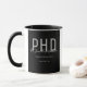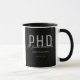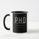 Eine Doktortitel-Tasse, die den Namen des Absolventen, das Studiengebiet und das Datum des Abschlusses enthält. Die Tasse enthält den Namen in einem Schriftart mit Handschriftenschrift. Das Design ist in Schwarz, Grau und Weiß gehalten. Es ist großartig wie ein Sake oder ein Gastgeschenk. Fügen Sie einfach die Informationen des Absolventen hinzu, fügen Sie diese Tasse in Ihren Warenkorb, und herzlichen Glückwunsch zu diesem wichtigen Meilenstein! Graduate Black Name Graduate PhD Tasse Holidayday Design | ©Melissa Patton - Designer