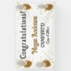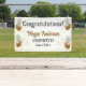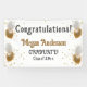 Ein Hanging Abschluss Glückwunsch Banner mit goldfarbenem Text auf weißem Hintergrund mit goldfarbenen und weißen Ballons und Glitzern. Um eine persönliche Note zu erhalten, ersetzen Sie einfach den Beispielnamen durch Ihre Daten.