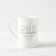 Eine Tasse zur China der Knochen des Doktoranden, die den Namen, das Studiengebiet und das Datum des Abschlusses des Absolventen enthält. Die Tasse enthält den Namen in einem Schriftart mit Schriftzeichen und einem Schwarz-Grauen Design. Es ist großartig wie ein Sake oder ein Gastgeschenk. Fügen Sie einfach die Informationen des Absolventen hinzu, fügen Sie diese Tasse in Ihren Warenkorb, und herzlichen Glückwunsch zu diesem wichtigen Meilenstein! Graduate Keepake Black Gray Name Grad PhD Knochen China Tasse Holidayday Design | ©Melissa Patton - Designer