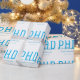 PhD Graduiertenpackpapier, das den Namen des Absolventen, das Studienfeld und das Abschluss-Datum enthält. Dieses Papier enthält den Namen in einem handgeschriebenen Skript-Schriftart und einem weißen und blauen Design. Fügen Sie einfach die Informationen des Absolventen hinzu, fügen Sie dieses Packpapier in Ihren Warenkorb und lass der Feier beginnen!