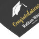Dieser schwarze Tischläufer hat eine weiße Graduiertenkappe über dem Text. Im Text anzeigen steht 'Glückwunsch' in Imitaten goldenes Skript. Sie können den weißen Text anpassen, um den Namen des Absolventen anzuzeigen. Sie können auch das Jahr hinzufügen, in dem der Schüler unter dem Namen geschlossen ist.