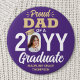Show your joy for the graduating senior with a stylish custom photo "Proud Dad" round graduation button. The picture and text on this template are simple to personalize. The colors and font styles can be changed with the Zazzle Design Editor tool. Featuring elegant modern typography and stylish calligraphy script, the purple and gold design includes the graduate's photo, name, and class year. Please note that the gold is printed color, not metallic foil. This keepsake accessory adds a unique touch to a commencement ceremony or graduation party outfit. Congratulations to the graduate!