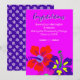 Unique and colorful graduation announcement with hibiscus flowers art. Tropical, hot pink color with dark purple, and off-white text. Three hibiscus flowers make a wide border at the bottom.. Fill in the templates to announce a daughter's graduation from high school or college. The reverse contains a pattern of graduation caps.